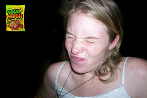 여자가 찡그린이유는 너무 신맛이 나서겠군요. 이건 새콤달콤 광고군요.