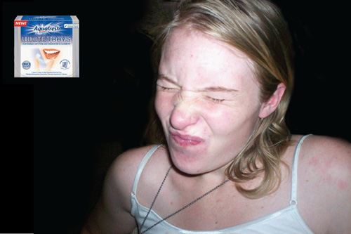 여자가 찡그린이유는 앞에 누군가 눈부신 이를 가지고 있어서 겠군요. 이건 미백제 광고군요.